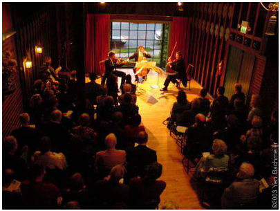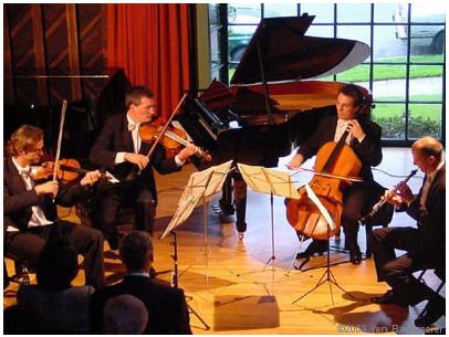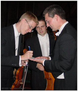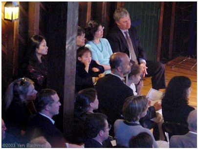 ![]() Forest Hill 2003 festival artists in front of the clubhouse. From left to right: Michael Ingham, Nikolaus Straka, Alexander Burggasser, Mari Kodama, Peter Sagaischek, Mari Kodama, Martin Zalodek, Maestro Kent Nagano, Clemens Horak and Dr. Christian Meyer ![]() Maestro Kent Nagano opened the festival ![]() Mari and Momo beamed after a triumphant first concert ![]() Martin Zalodek, first violin ![]() Clemens Horak and the Vienna Trio-Plus ![]() Martin Zalodek, Peter Sagaischek, Mari Kodama, Alexander Burggasser and Nikolaus Straka ![]() Nikolaus Straka, Clemens Horak, Mari Kodama, Peter Sagaischek and Martin Zalodek ![]() The Vienna Trio-Plus performed in a packed house ![]() Post performance celebration ![]() Transfixed audience ![]() Alexander Burggasser, Nikolaus Straka and Peter Sagaischek signing autographs ![]() The Vienna Trio-Plus relaxing after a performance |